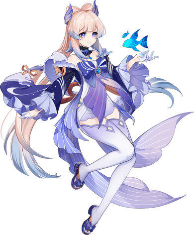 | Summons the might of Watatsumi dealing Hydro DMG to opponents, robing Kokomi in a Ceremonial Garment made from the flowing waters of Sangonomiya. |